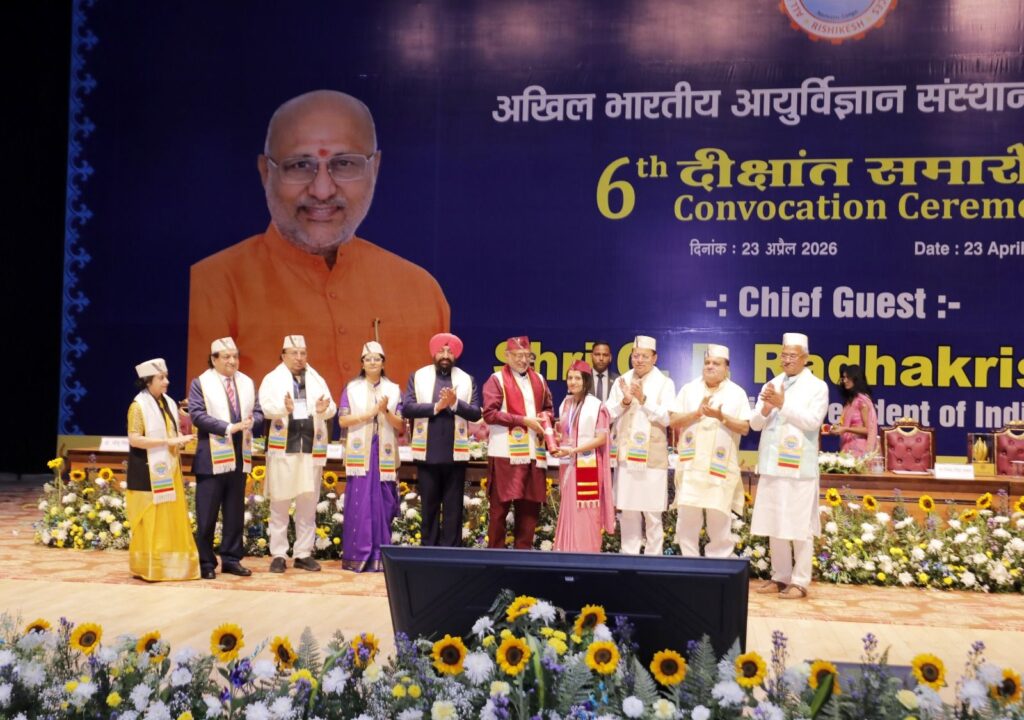 6th Convocation Ceremony of the All India Institute of Medical Sciences (AIIMS), Rishikesh, was grandly organized on Thursday. During the ceremony, the country’s Vice President, Shri C.P. Radhakrishnan, honored 11 medical students by presenting them with gold medals at the 6th Convocation of AIIMS Rishikesh. Additionally, degrees were conferred upon 386 students of the institute during the convocation ceremony. Speaking on this occasion, he addressed the medical students who had received their degrees and were embarking on their careers as physicians, stating that upholding the patient’s trust must be a doctor’s primary responsibility. He remarked that the journey of becoming a doctor involved not only the role of teachers but also the special guidance of parents; he urged the students never to forget these two pillars in their lives.
