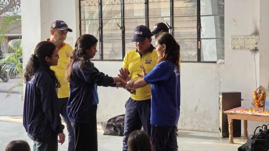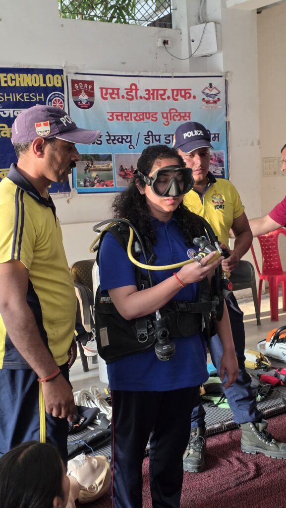 In addition to theoretical knowledge, the SDRF team introduced participants to specialized equipment used in rope rescue operations, deep diving, and flood rescue scenarios. The hands-on exposure aimed to build familiarity with critical tools and instill the confidence needed to respond effectively during emergencies.